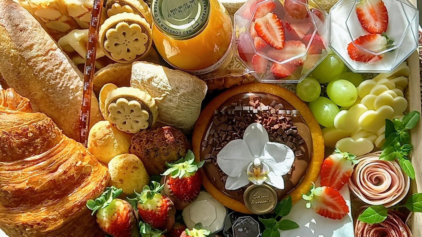Servido em bandeja (35x25cm), baguete francesa, croissant, ciabatta, biscoitos de queijo, waffle de Liège, stroopwafel, sfogliatine, madeleine, queijo brie e mussarela, 2 flores de charcutaria, bolo com cobertura, morangos com chocolate, uvas, iogurte grego, geleia, manteiga, cream cheese, salada de frutas, granola, suco integral, 2 cafés drip, chá e cappuccino, nuts e lâminas de chocolate.